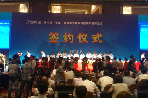 2012年9月7日上午,第二届AG恒峰(宁波)智慧城市技术与应用产品博览会签约仪式在宁波香格里拉大酒店举行,共有物联网、云计算、智慧交通、智慧教育等智慧城市建设相关领域的23个项目签约。我区工业机械手生产项目、新型光电传感器及配件生产项目在会上签约。